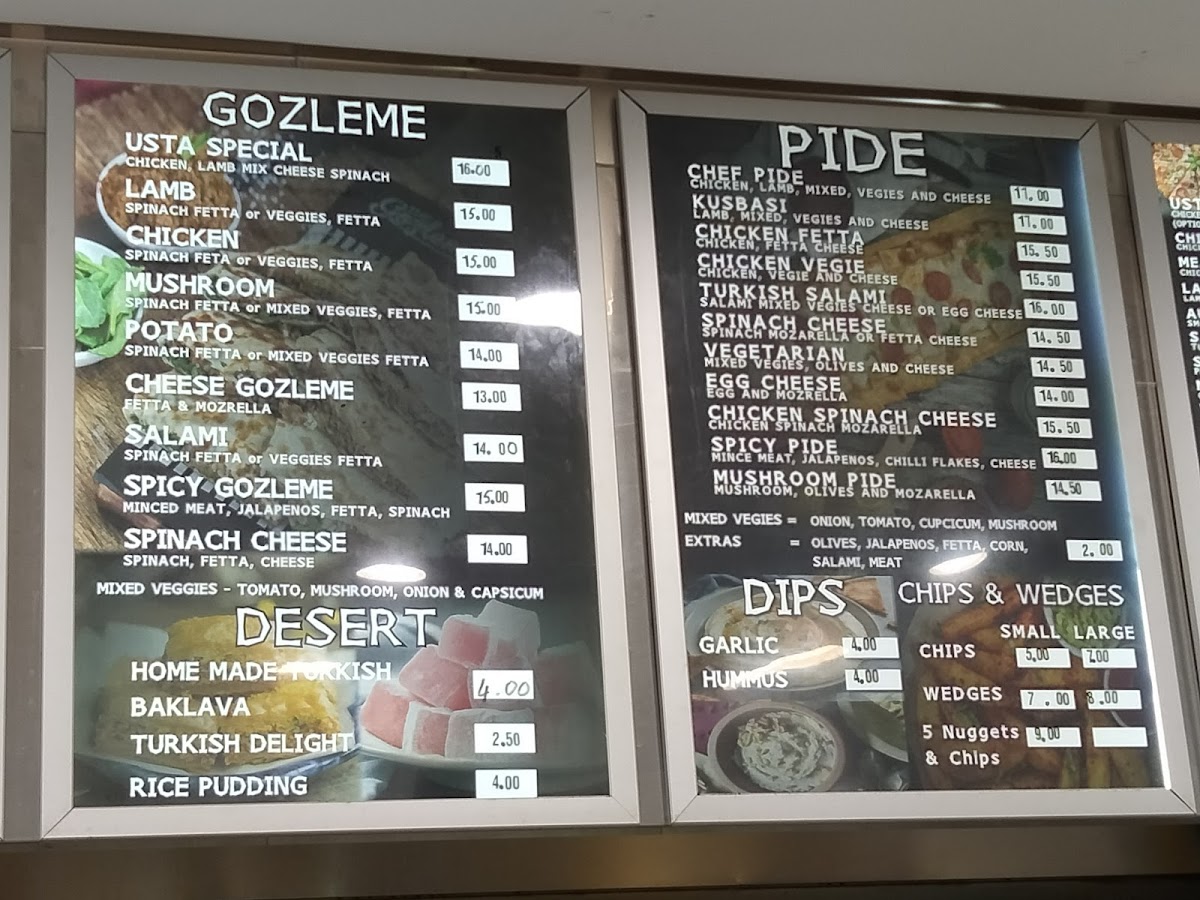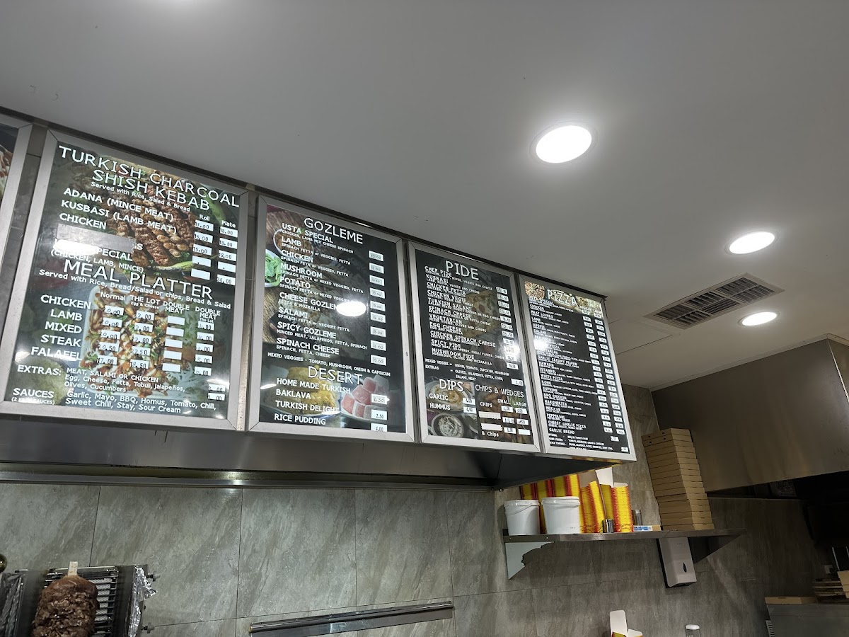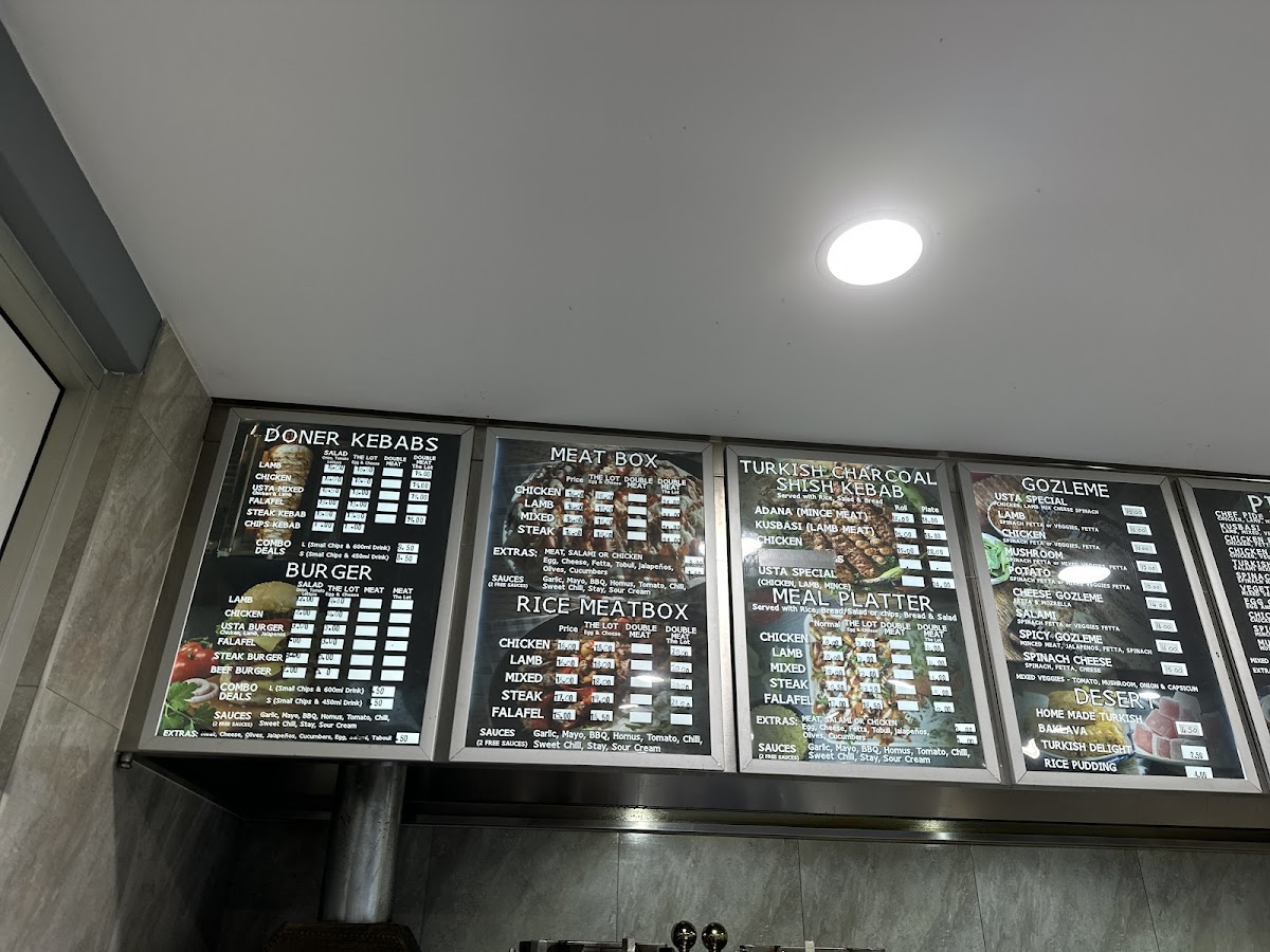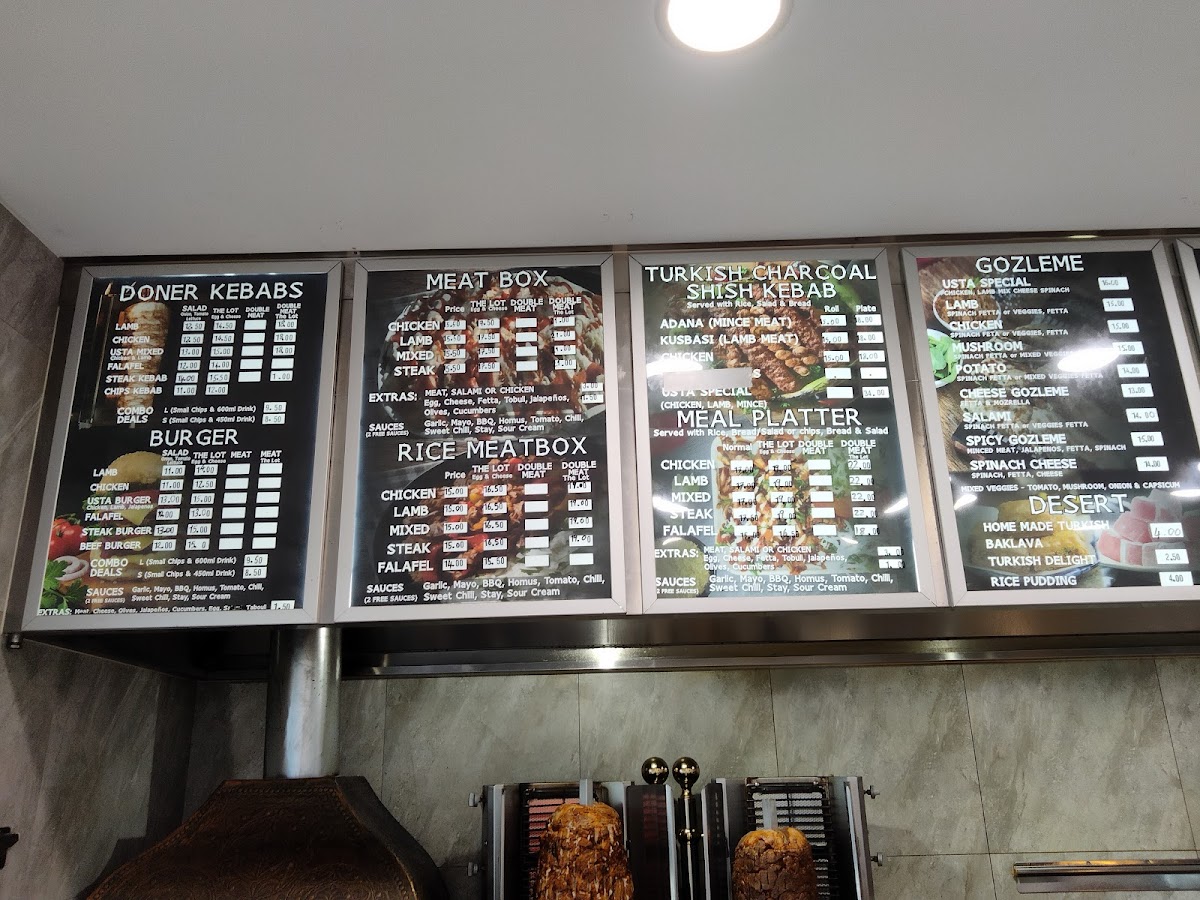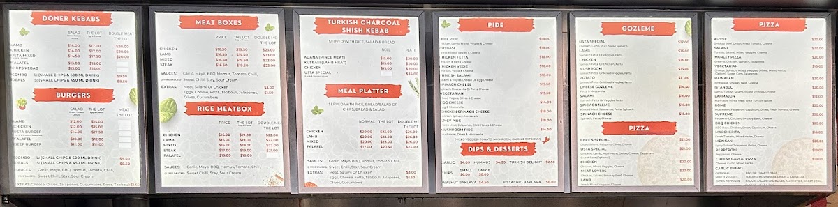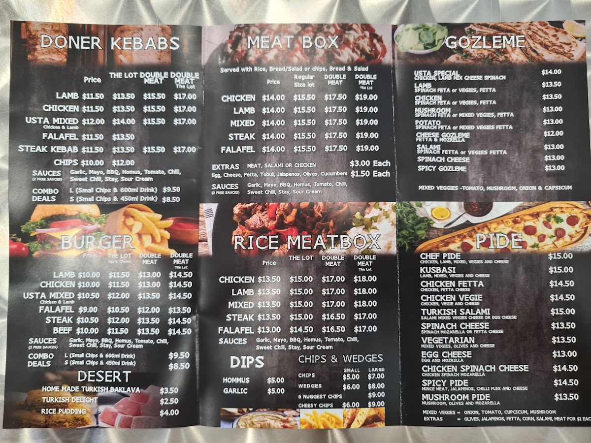 Usta Grill offers a diverse and flavorful menu that reflects the rich culinary traditions of Turkey, with options catering to various tastes. For a savory start, their Gozleme options, such as Chicken and Usta Special, provide a delicious, fresh-filled pastry, while the Spicy Gozleme adds a zesty kick. If you're in the mood for pizza, try the Hawaiian or Pepperoni, with the option to pair with Garlic Bread. Their Rice Meat Box selections, including Lamb and FalafelChicken, make for hearty meals, as do the various Meat Boxes featuring Lamb, Mixed, and Chicken. For burger lovers, the Beef Burger, Lamb Burger, and unique Usta Burger offer satisfying bites, and there's a vegetarian-friendly FalafelChicken option as well. The Turkish Charcoal Shish Kebab is a standout, with varieties like Usta Special, Chicken, and Kusbasi (Lamb Meat). The Pide options, such as Mushroom Pide and Chef Pide, provide a great alternative to pizza. Sides like Hummus and Garlic dips are perfect for pairing, and the Meal Platters allow you to sample a variety, with choices like Falafel, Lamb, and Mixed Chicken. For those craving a quick snack, the Doner Kebabs, including the Lamb Kebab and Chicken Kebab, are great options. Don't forget to indulge in a sweet treat like Rice Pudding, Home Made Turkish Baklava, or Turkish Delight. If you're after a light bite, try the Chips varieties, including Cheesy Chips and WedgesChips, or enjoy a comforting plate of 6 Nuggets & Chips. The menu at Usta Grill presents an exciting blend of traditional and contemporary Turkish flavors, perfect for anyone seeking a satisfying meal.